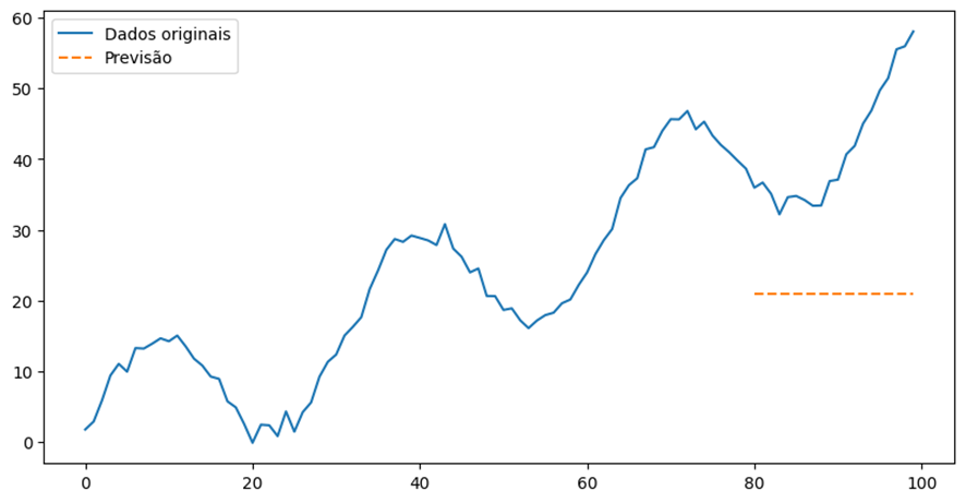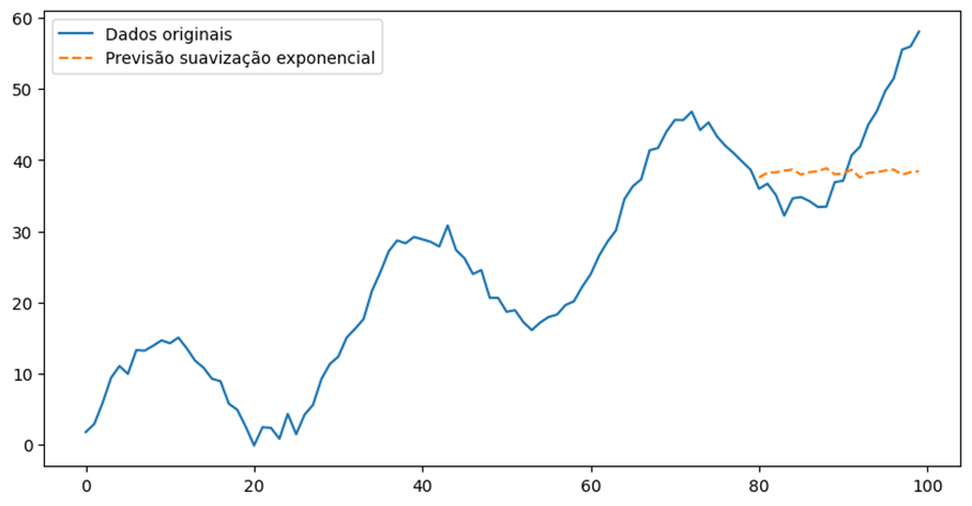 Outro erro comum destacado na literatura envolve o tratamento inadequado da dependência do tempo em modelos preditivos. Muitos analistas não consideram que as observações numa série temporal estão correlacionadas, o que contradiz os pressupostos básicos de muitos métodos estatísticos tradicionais. Como explicou Zemkoho[3], ignorar a autocorrelação entre períodos consecutivos pode levar à subestimação da incerteza e a previsões que não refletem a verdadeira dinâmica dos dados. Esta supervisão é particularmente importante em modelos como o autorregressivo integrado de médias móveis (ARIMA) e a suavização exponencial, nos quais a suposição de independência pode invalidar as previsões e comprometer a integridade das conclusões obtidas. A Figura 2 mostra que as previsões geradas pelo modelo de suavização exponencial (linha tracejada) não conseguem capturar as tendências e a sazonalidade presentes nos dados originais. A previsão tenta capturar uma média móvel dos dados, mas não segue a verdadeira dinâmica da série temporal. Isto resulta em previsões que não refletem totalmente as flutuações e a dinâmica dos dados reais.