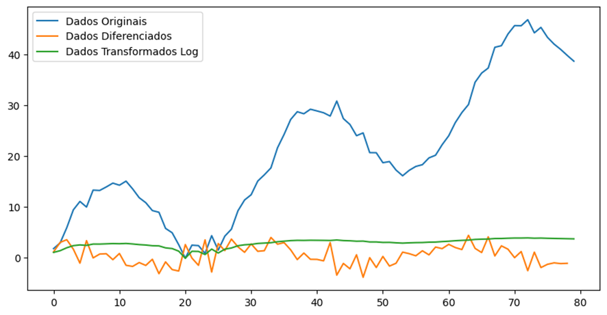 O gráfico da Figura 3 mostra os dados originais de uma série temporal (linha azul) com tendências e sazonalidade, comparados com os dados diferenciados (linha laranja) e transformados logaritmicamente (linha verde). Os resultados do teste ADF nos dados originais indicaram que a série não era estacionária (estatística ADF de 0,292 e p-valor de 0,977). Após a diferenciação, a série tornou-se estacionária (estatística ADF de -6,094 e p-valor de 1,02e-07). Transformar a série para estacionariedade é um passo necessário para muitas técnicas de modelagem de séries temporais. No entanto, essas transformações devem ser realizadas cuidadosamente para garantir que os dados estejam adequadamente preparados para a modelagem subsequente.