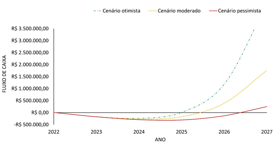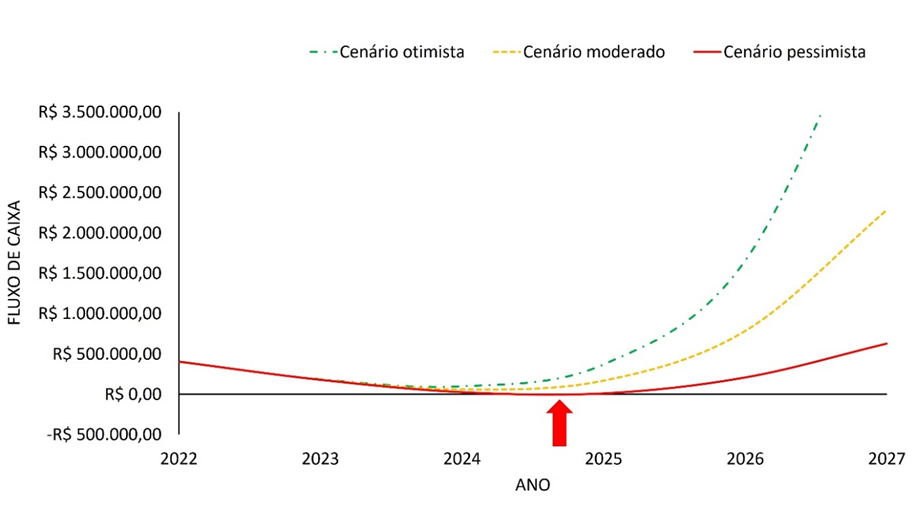 Figura 1. Previsão de “breakeven”: quarto ano no cenário otimista, quarto ano no cenário moderado e quinto ano no cenário pessimista
