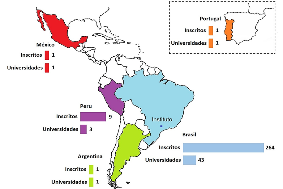Soma-se a isto o fato de que somente o instituto possui cerca de 100 alunos de pós-graduação, estando inserido em um campus com diversos outros programas de pós-graduação. No molde presencial, praticamente todas as vagas disponíveis do evento eram preenchidas na escala local. Em algumas ocasiões, alunos e pesquisadores de universidades próximas a região da cidade sede conseguiam participar do evento, mas dificilmente o simpósio recebia inscrições de fora do estado de São Paulo, por exemplo. No formato digital obtivemos centenas de inscrições de discentes, funcionários e docentes de 43 universidades de 18 estados brasileiros além do Distrito Federal (São Paulo, Rio de Janeiro, Espírito Santo, Minas Gerais, Rio Grande do Sul, Mato Grosso, Mato Grosso do Sul, Pernambuco, Alagoas, Maranhão, Ceará, Paraíba, Sergipe, Rio Grande do Norte, Tocantins, Rondônia, Pará e Amazonas) e 6 universidades internacionais de quatro países (Argentina, Peru, México e Portugal). Portanto, a escala do evento mudou de local para internacional (Figura 1).