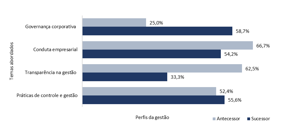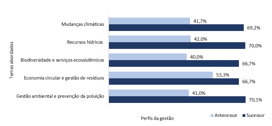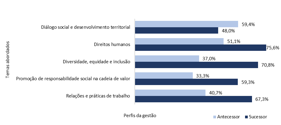 Os avanços no eixo social foram impulsionados por investimentos em capacitação e melhores condições de trabalho. Observou-se maior engajamento com a comunidade local, com iniciativas como doações para projetos culturais. Os percentuais de cumprimento no eixo social entre a gestão do antecessor e do sucessor, que tiveram a média de atendimento aos temas do eixo foram de 46,1% e 65,8%, respectivamente (Figura 2).