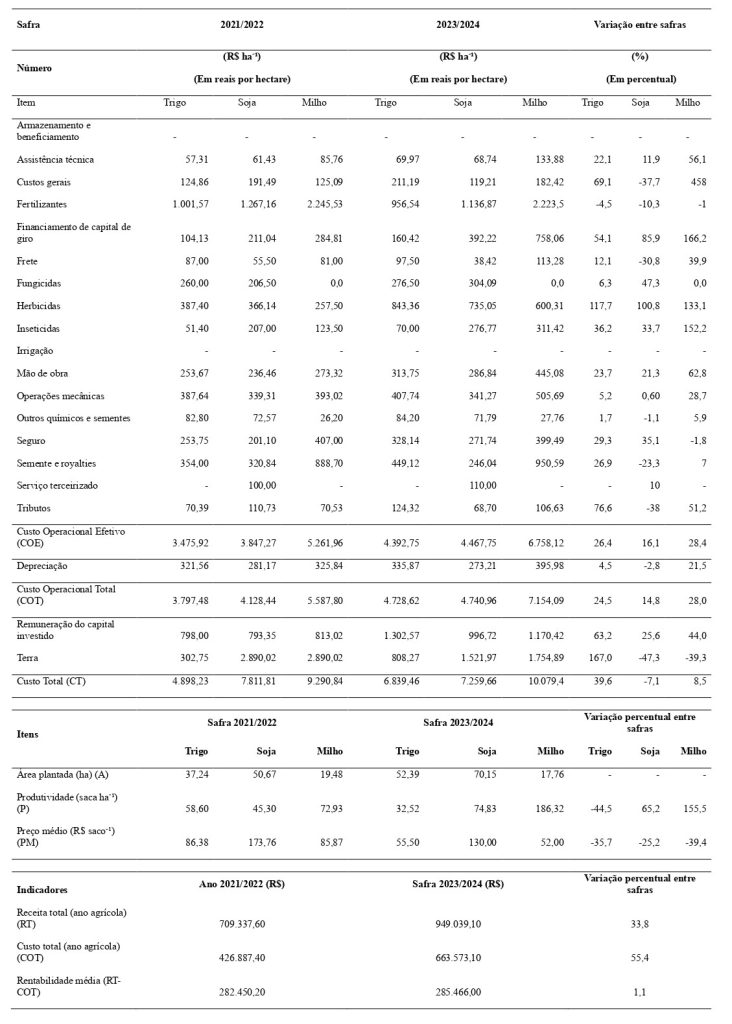 Os dados foram coletados de registros contábeis e produtividades das culturas de soja, milho e trigo nos anos de 2021/22 e 2023/24. A norma ABNT PR 2030 foi aplicada para avaliar 42 critérios distribuídos em três eixos: ambiental (E), social (S) e governança (G) (ABNT, 2022). Adicionalmente, utilizou-se a metodologia de Matsunaga et al.[3] para calcular os custos de produção, incluindo custos operacionais efetivos (COE), totais (COT) e totais de produção (CT). A metodologia adota o conceito de custo de produção global, incluindo custos fixos e variáveis. Utiliza o custo operacional do IEA, considerando despesas desembolsadas, depreciação e mão de obra familiar, enquanto outros fatores são absorvidos pelo “resíduo”, facilitando decisões produtivas em cenários inflacionários[3].