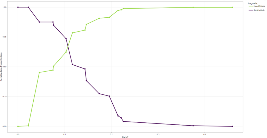 A partir da Figura 1 é possível analisar as curvas de sensibilidade e especificidade. Sua análise revela um ponto ótimo de cutoff aproximadamente igual a 0,12, o que representa um equilíbrio entre sensibilidade e especificidade. É notável que a curva de especificidade apresenta uma alta taxa de acertos para quase todos os valores de cutoff, enquanto a curva de sensibilidade exibe um comportamento oposto, com a taxa de acerto diminuindo significativamente para pontos de cutoff superiores a 0,15. Percebe-se ainda que o modelo está bem calibrado para prever o não evento (não evasão). No entanto, sua eficácia na previsão da evasão é menos consistente. Isso sugere que, para valores mais elevados de cutoff, o modelo tende a cometer mais erros ao prever a evasão. Esse comportamento pode impactar negativamente a eficiência geral do modelo. Assim, para aprimorar a capacidade do modelo em prever a evasão, pode ser benéfico considerar a inclusão de novas variáveis explicativas, bem como utilizar uma amostra maior.
