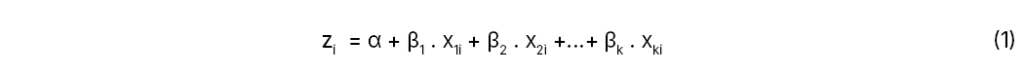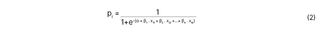 em que Z é denominado logito, α é uma constante, βj (1, 2, …, k) são os parâmetros estimados da variável explicativa Xj (métricas ou variáveis dummy) e o subscrito i representa cada observação da base de dados. No mesmo contexto, o autor descreve que a probabilidade estimada de que um determinado evento ocorra pode ser definida pela eq.(2).