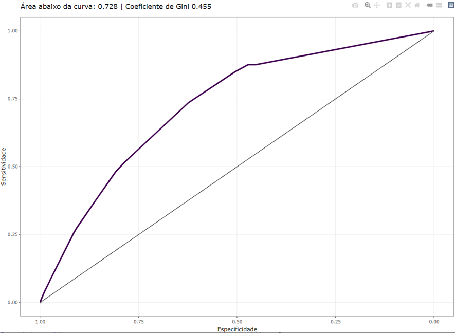 Após a análise dos coeficientes é importante analisar as métricas que validam o poder preditivo do modelo. Essa análise foi realizada por meio da curva receiver operating characteristic [ROC], pela curva de sensibilidade e pela curva de especificidade, além da matriz de classificação.