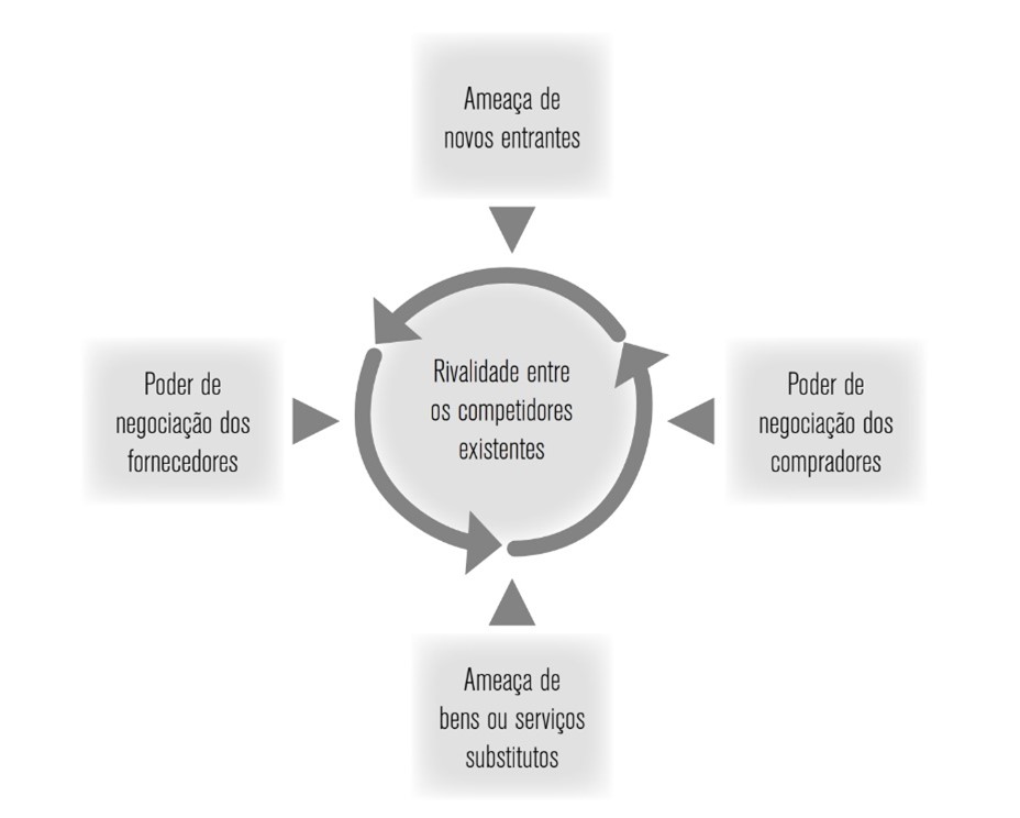 Para qualquer organização, formular uma estratégia é o ponto de partida para tomada de decisão. De acordo com Magretta[18], tal estratégia esclarece como uma organização, diante da competição, alcançará desempenho superior, através da definição de parâmetros que afiram seu desempenho. O esquema presente na Figura 1 mostra as forças citadas, detalhadas na sequência.