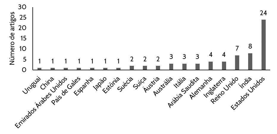 Observou-se que a maioria dos artigos pertence à região dos Estados Unidos (24), seguidos pela Índia (8), Reino Unido (7), Inglaterra e Alemanha (4), Arábia Saudita, Itália e Austrália (3), Áustria, Suíça e Suécia (2), Estônia, Japão, Espanha, País de Gales, Emirados Árabes Unidos, China e Uruguai (1). Vale ressaltar que o número de artigos por país é maior que o número de artigos encontrados, uma vez que um ou mais artigos representam mais de um país quando analisados nas bases pesquisadas.