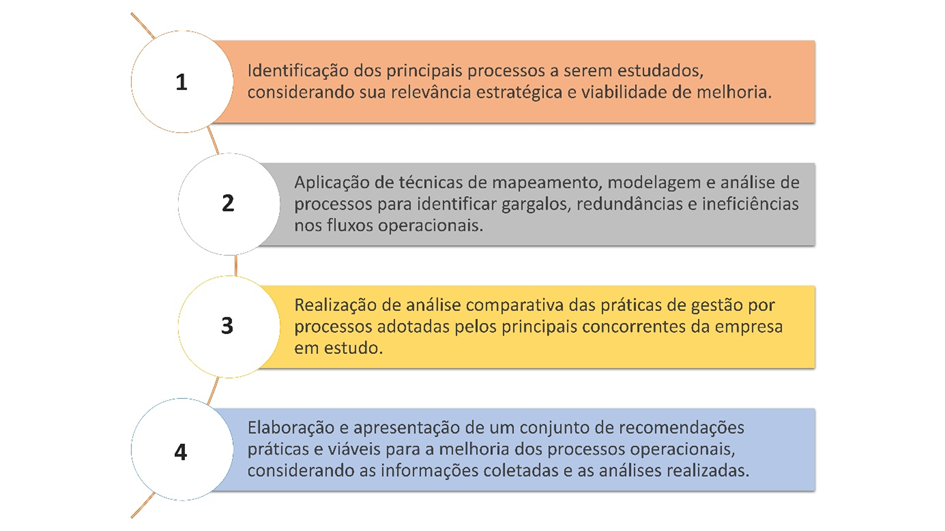 Pesquisa bibliográfica | Revisão de literatura em bases científicas sobre gestão de processos e melhoria contínua[9,10] | Identificação dos gargalos: detectar pontos críticos que afetavam a eficiência operacional e a qualidade | Proporcionou fundamentação teórica e melhores práticas para subsidiar a análise crítica dos processos da empresa |