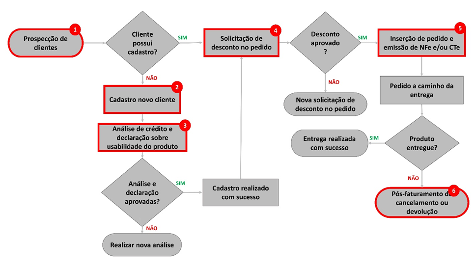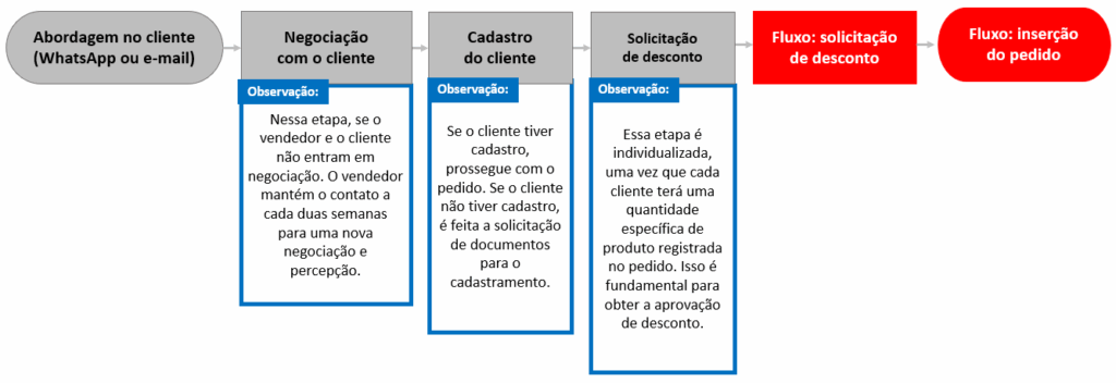 Para este estudo, foram mapeados processos na área comercial que estão diretamente ligados ao canal de distribuição dos produtos, ou seja, aos fluxos operacionais da empresa. A metodologia adotada para o mapeamento do processo integrou a análise de documentos internos da empresa e a vivência prática de um profissional experiente. Foram analisados procedimentos operacionais padrão, relatórios de desempenho e registros históricos, o que possibilitou identificar áreas críticas e pontos de melhoria.