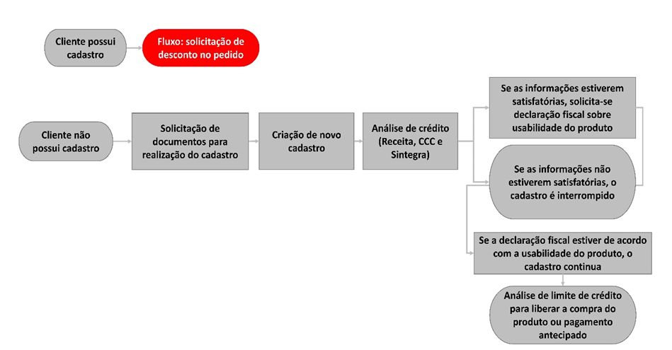 Na etapa de cadastramento do cliente (Figura 5), se o cadastro já existisse, o processo seguia de forma mais fluida, caso contrário, iniciava-se um novo cadastro, o que envolve a solicitação de documentação. Em seguida, era feita uma verificação da situação fiscal do cliente: se estivesse regularizada, o cadastro era concluído; se não, era interrompido.