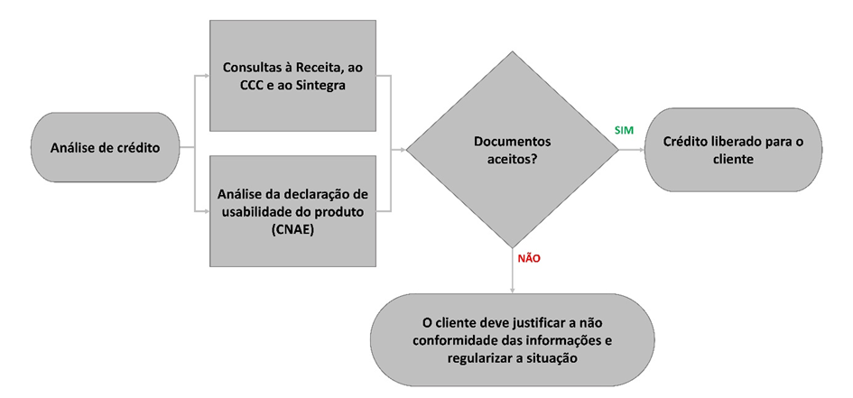 A etapa sobre análise de crédito (Figura 6) incluía a verificação dos dados disponíveis na Receita Federal, no Cadastro Centralizado de Contribuintes (CCC) e no Sistema Integrado de Informações sobre Operações Interestaduais com Mercadorias e Serviços (Sintegra), que fornecem informações sobre a situação fiscal e cadastral do cliente.
