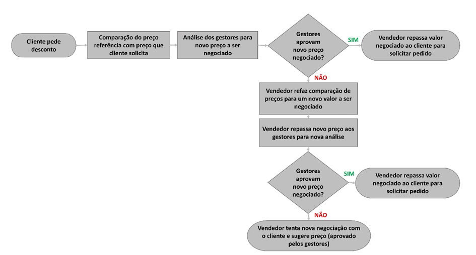A fase de negociação (Figura 7) permite que o cliente sugira um preço, e o vendedor também deve barganhar. Quando o cliente solicitava um desconto, o vendedor precisava comparar o preço de referência com o preço com desconto solicitado pelo cliente. O preço de referência é um valor médio utilizado como base para avaliar a viabilidade dos descontos solicitados, calculado com base em custos, margens de lucro e preços de mercado.