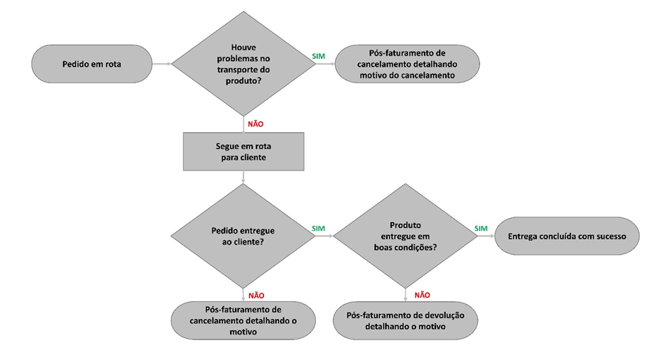 Na etapa sobre logística da entrega, o pedido já foi realizado, e a entrega, programada. Se o cliente recebesse o produto corretamente e sem qualquer tipo de avaria, o fluxo logístico de entrega era encerrado com sucesso. Caso contrário, seria necessário abrir um processo de pós-faturamento para cancelamento ou devolução do pedido e passar para a etapa de gestão de devolução ou cancelamento (Figura 8). Esse processo não apenas assegura a integridade da entrega, mas também demonstra um compromisso com a qualidade e a resolução ágil dos problemas que possam surgir.