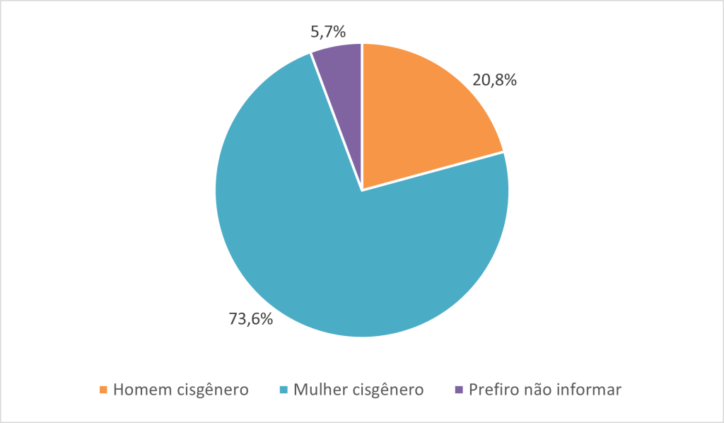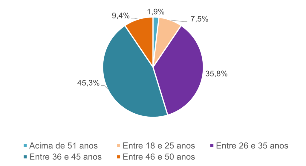 Na seção 1, “Perfil e mapeamento”, constatou-se que mais de 73% dos respondentes eram mulheres (Figura 2) e que pouco mais de 45% possuíam entre 36 e 45 anos (Figura 3). Segundo uma pesquisa de 2017 publicada pela Associação Brasileira de Recursos Humanos[12], o Brasil tinha cerca de 111 mil profissionais atuantes na área naquele ano, sendo pouco mais de 75% deles mulheres.