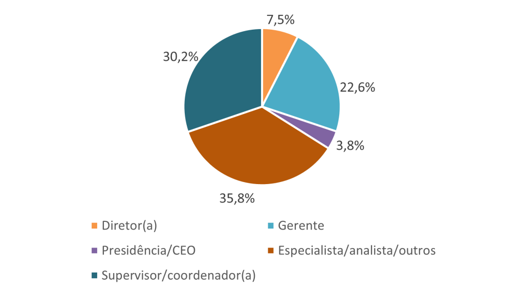 A maioria dos participantes deste questionário (64%) ocupava níveis de liderança, distribuídos em presidência, diretoria executiva, gerência, coordenação e supervisão (Figura 4). Tratava-se, portanto, de uma amostragem importante, uma vez que a cultura de uma empresa depende principalmente da atuação da liderança[4].