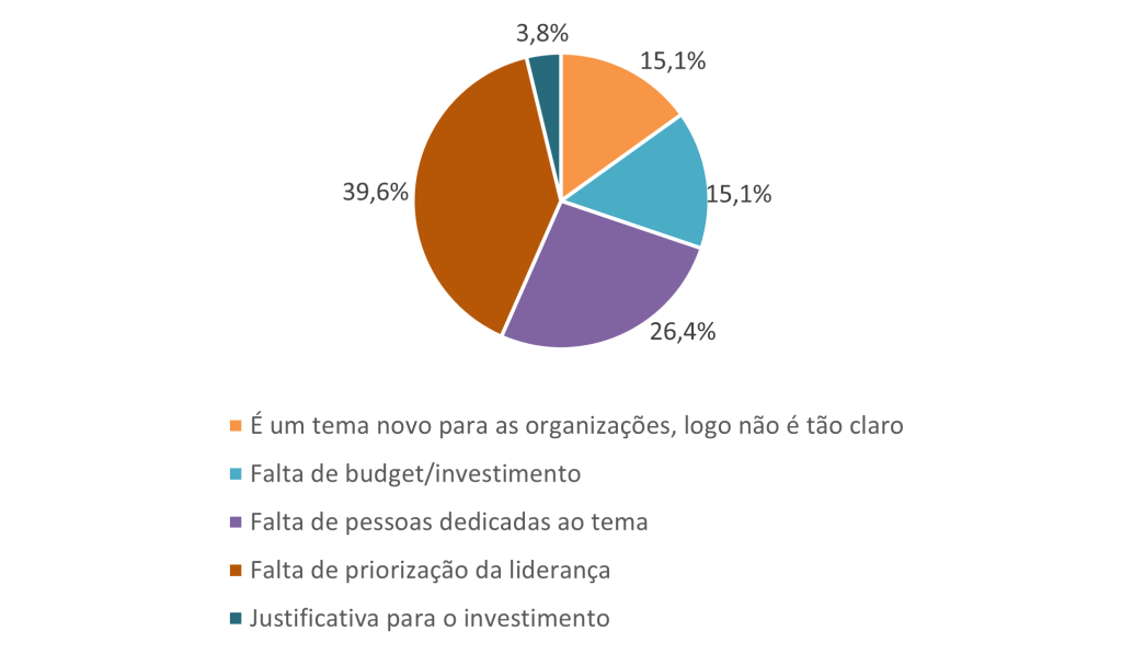 Ainda na seção 1, mais de 64% dos respondentes afirmaram que suas empresas ainda não possuíam o processo de EX implementado (Figura 5), colocando a “falta de priorização da liderança” (39,6%) e a “falta de pessoas dedicadas ao tema” (26,4%) como as principais barreiras para a implementação ou melhoria dessa estratégia (Figura 6). Tais dados reforçaram as informações da pesquisa “Global Human Capital Trends”, da Deloitte[9], feita com mais de 10 mil líderes em 140 países em 2017, em que 59% dos respondentes disseram não se sentir prontos para o desafio da experiência do colaborador.