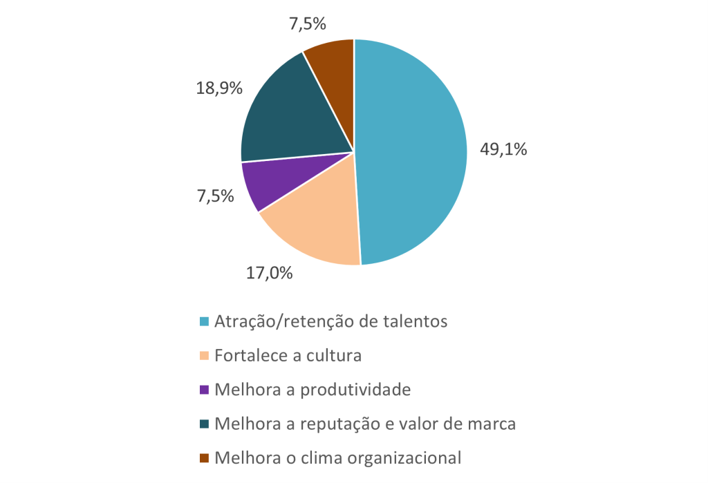 Na opinião de 49,1% dos participantes, investir em EX impacta principalmente a atração e a retenção de talentos; para quase 19% dos respondentes, o ganho está voltado para “reputação e marca” (Figura 9). Esses dados estiveram alinhados a uma pesquisa feita pelo LinkedIn com mais de 70 mil líderes em 35 países, em que 77% dos respondentes afirmaram que colocavam seus esforços em EX com uma expectativa clara de melhorar principalmente a retenção de seus talentos[14].