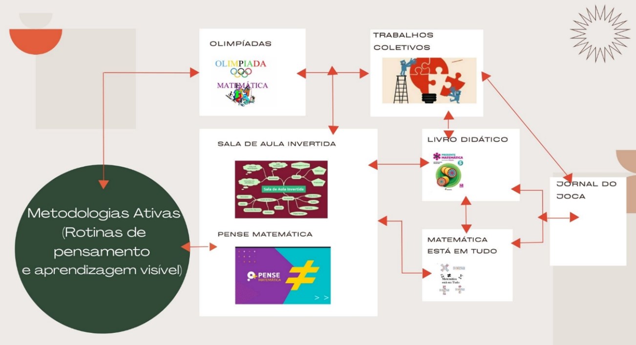 As atividades propostas ao longo do semestre observado em 2021, bem como início de 2022 foram compostas por sete eixos de ações pedagógicas: preparação para as olimpíadas de matemática propondo-se desafios diversificados em sala; trabalhos coletivos, cooperativos e colaborativos; utilização do livro didático como um meio de sistematização dos conceitos apresentados; aulas invertidas como forma de primeiros contatos com conceitos a serem apresentados; espaço “Pense Matemática” em que muitas das aulas acontecem de forma lúdica, momentos estes em que os e as estudantes tornam-se pesquisadores e testadores de possibilidades e estratégias de resolução e o jornal usado no Colégio (Joca) que permite a conexão com assuntos reais do contexto de todos e todas. O mapa mental na Figura 1 ilustra como esses materiais foram idealizados, organizados e apresentados aos pais e à coordenação da escola.