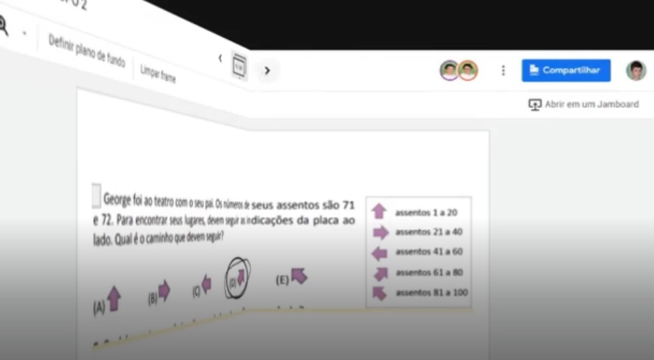 Nessa dinâmica as crianças eram convidadas a vir à frente da sala e expor como conseguiram chegar à solução do problema proposto. Nesse problema específico a solução não seria dada por meio de uma equação ou de uma resolução matemática clássica. Para saber qual grupo de assentos estavam localizados os lugares de George e de seu pai foi necessário aplicar conhecimentos prévios de espacialidade, direção, quantificação e da configuração estrutural de uma sala de teatro.