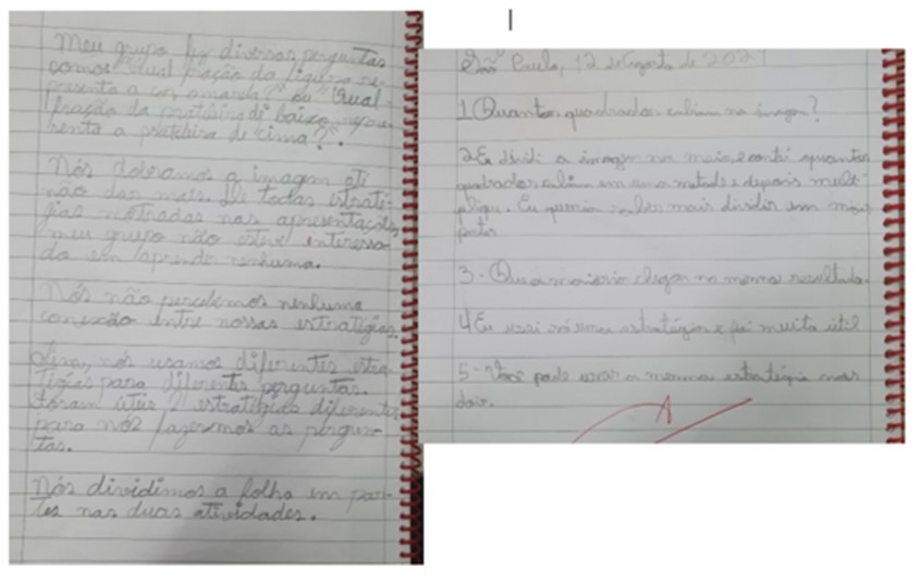 Durante a partilha os discentes perceberam como as questões iniciais relacionavam-se com as imagens investigadas. Houve engajamento no momento na troca de estratégias entre os grupos, nos quais os estudantes comparavam semelhanças e distanciamentos. Os registros feitos nos cadernos ajudaram a estruturar na escrita matemática o conhecimento construído (Figura 4). Etapa que permitiu a organização, esclarecimento e sistematização do pensamento. Ao discutir, refletir e retomar o assunto em diferentes contextos, as crianças conseguiram mergulhar no conteúdo, promovendo uma aprendizagem profunda.