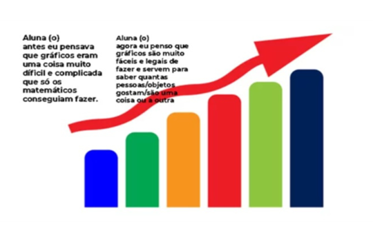 Com a ajuda da ferramenta Khan Academy, foi proposto aos alunos que eles elaborassem gráficos de barra seguindo os exercícios da plataforma. Em seguida, os estudantes inverteram o processo e elaboraram gráficos para representar imageticamente a própria aprendizagem. Seguiu-se aqui o processo de aprendizagem visível e rotinas de pensamento que comportam três etapas: ver, pensar e argumentar. As crianças fizeram perguntas acerca da definição, dos usos e da pertinência de gráficos. Houve um momento de reflexão sobre quais eram as perspectivas sobre os gráficos antes e depois do estudo. Um dos resultados foi o gráfico apresentado na Figura 5. Nos comentários feitos pelo aluno em questão percebe-se uma proximidade da criança com a matemática. Antes os gráficos seriam habilidades exclusivas de matemáticos. Agora os gráficos pertenciam ao universo do estudante, sendo possível e até divertido elaborá-los[11].