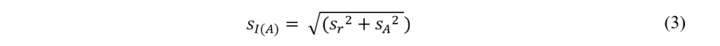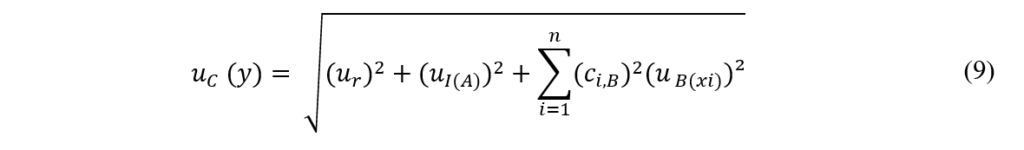 onde, uc(y): é a incerteza-padrão combinada; ur: é a incerteza-padrão referente à repetibilidade; uI(A): é a incerteza-padrão referente à precisão intermediária; Ci,B: é o coeficiente de sensibilidade do tipo B em i; uB(xi): é a incerteza-padrão do tipo B em xi[8],[9].