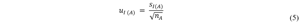 onde, uI(A): é a incerteza-padrão referente à precisão intermediária de um fator (analistas diferentes); sI(A): é a estimativa do desvio-padrão da precisão intermediária; nA: é o número de analistas[12].