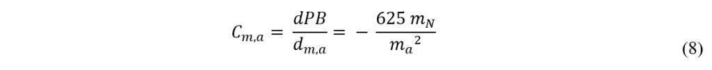 onde, Cm,a: é o coeficiente de sensibilidade da massa de amostra (% mg-1); dPB/dm,a: é a derivada primeira da concentração de proteína bruta em função da massa de amostra (% mg-1); mN: é a massa média de nitrogênio detectada na matriz testada (5,632 mg); ma: é a massa média de amostra pesada na balança analítica (85,0 mg)[8].