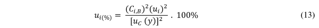 onde, ui(%): é a incerteza-padrão relativa em i; Ci,B: é o coeficiente de sensibilidade do tipo B em i (o valor numérico é igual a 1,0 para as incertezas-padrão do tipo A); ui: é a incerteza-padrão em i; uc(y): é a incerteza-padrão combinada[8].