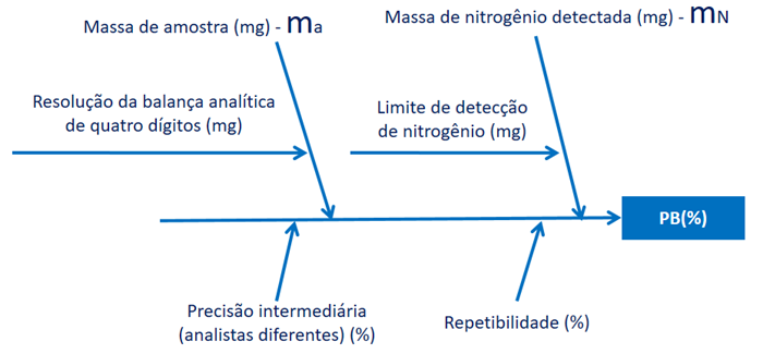 A incerteza de medição de proteína bruta engloba os contribuintes oriundos da equação do mensurando (Equação 15) e os contribuintes de validação de método (Figura 2). Como os resultados de precisão intermediária e de repetibilidade foram obtidos por estudo de precisão, baseado na norma NBR 14597, a avaliação é classificada como do tipo A. Os demais contribuintes são do tipo B, pois foram extraídos dos manuais dos fabricantes da balança analítica e do analisador elementar[10].
