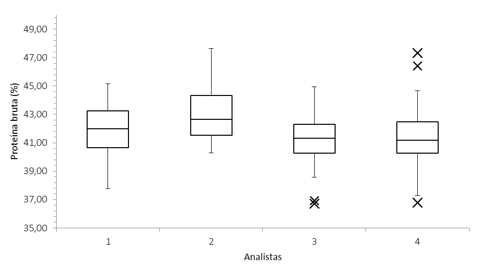 Quatro analistas participaram do ensaio de precisão e efetuaram oito determinações de proteína bruta em cada um dos sete frascos. Isso gerou 56 análises por analista[21].