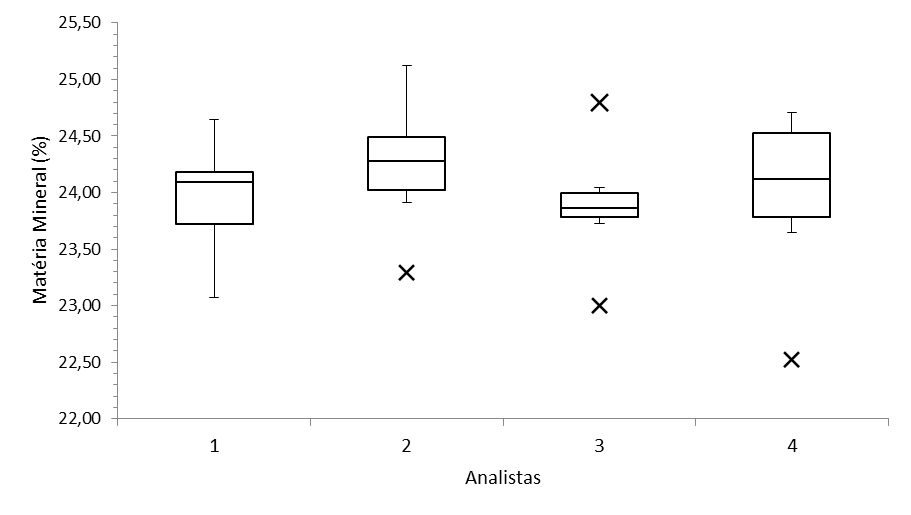Para estimar a incerteza da análise de matéria mineral, foi coletado um saco de 5 kg de insumo concentrado para suínos, pronto para comercialização. O insumo, em forma farelada, era composto principalmente por farelo de soja, farelo de arroz, farinha de carne e ossos de bovinos, calcário calcítico e cloreto de sódio, com especificação máxima de 25% de matéria mineral em base natural. A redução da amostra ocorreu por quarteamento e foi dividida em quatro subamostras de 500 g. As subamostras foram homogeneizadas por agitação rotacional em um recipiente fechado, moídas em moinho de bancada (IKA modelo A11) sem peneiramento e transferidas para frascos de 500 g, devidamente fechados e identificados (Compêndio Brasileiro de Alimentação Animal, 2023d). Quatro analistas participaram do ensaio de precisão e efetuaram sete determinações por frasco[21].