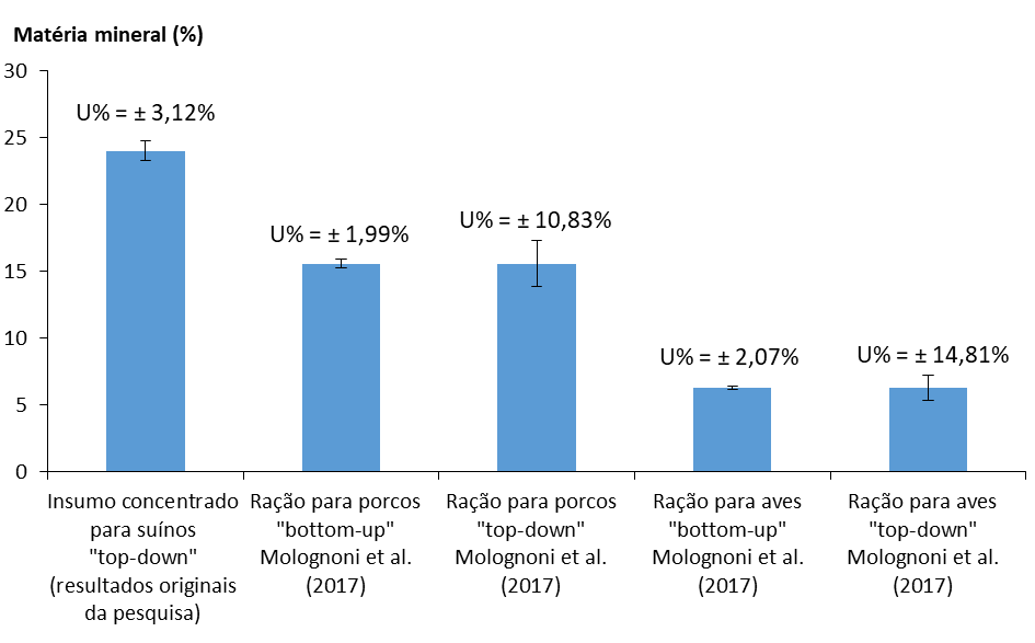 Para Molognoni et al.[6], a média de matéria mineral na ração para porcos foi de 15,60%, obtida a partir dos resultados de 101 laboratórios participantes, e os valores de incerteza relativa foram de 1,99% (“bottom-up”) e 10,83% (“top-down”), ambos em relação à média. A ração aviária apresentou média de 6,28%, obtida de 102 laboratórios, e os valores relativos de incerteza foram de 2,07% (“bottom-up”) e 14,81% (“top-down”).