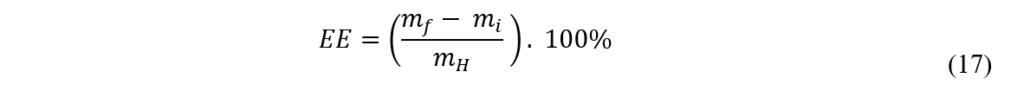onde, EE: é o teor percentual de extrato etéreo contido na amostra (%); mf: é a massa do copo de extrator com a gordura extraída (g); mi: é a massa do copo extrator vazio (em g); mH: é a massa de amostra a ser analisada (g).