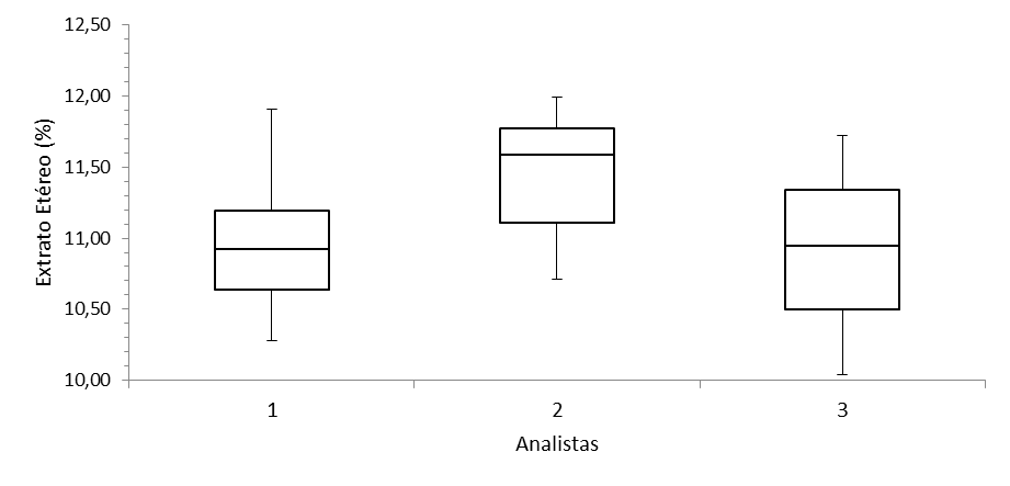 O gráfico da Figura 11 indica ausência de valores aberrantes em cada conjunto de resultados. O intervalo interquartílico do Analista 2 está entre 11,10% e 11,78%, o do Analista 1 entre 10,64% e 11,20% e o do Analista 3 entre 10,50% e 11,34%. Esses dados sugerem que os resultados do Analista 2 diferem dos demais.