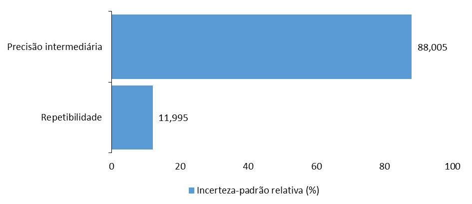 A incerteza associada à precisão intermediária corresponde a 88,01% da incerteza-padrão combinada, enquanto a da repetibilidade representa 12,00% (Figura 12). Com a substituição dos valores de incerteza-padrão na Equação 9, obteve-se incerteza-padrão combinada de 0,34% e expandida de ± 0,68% (Equação 10).