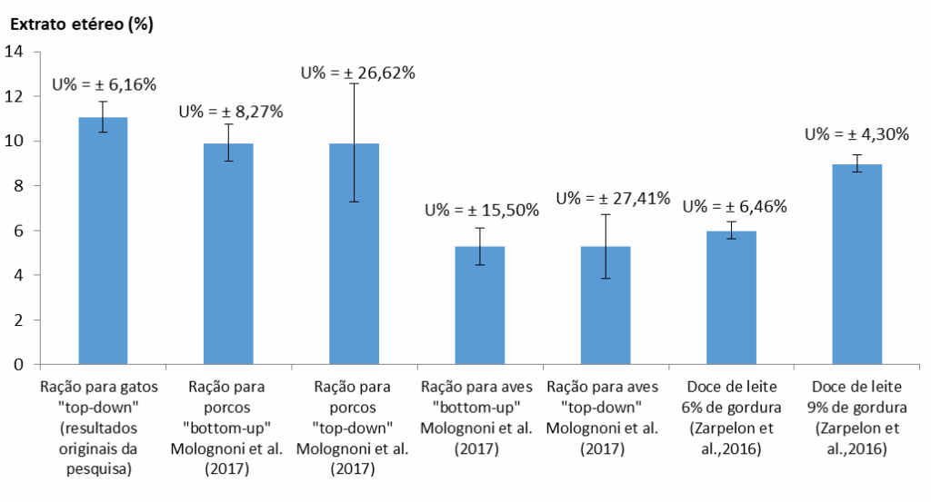 Apesar desses contribuintes, a incerteza relativa obtida nesta pesquisa foi semelhante aos resultados de Zarpelon et al.[8], que aplicaram método automatizado de hidrólise com extração de gordura. Como não realizaram estudos interlaboratoriais, a variabilidade dos resultados se limita às condições internas de cada laboratório.