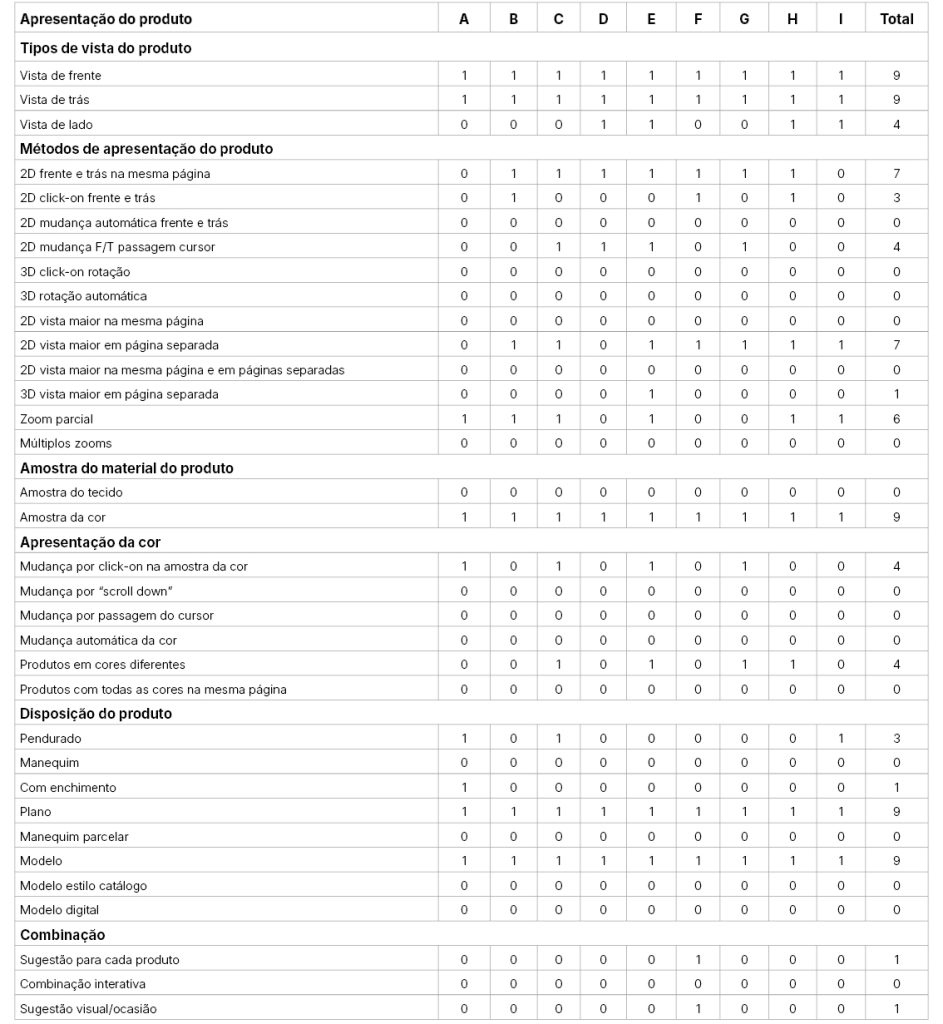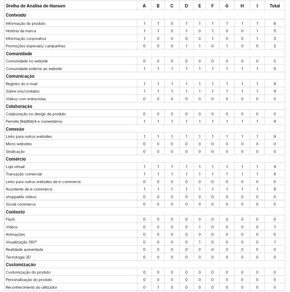 As grelhas de análise de Hansen e MVD foram preenchidas considerando o processo binário, no qual 1 significa presente e 0, ausente. Conforme Teixeira[5], esse método objetiva a pesquisa de fato e a facilidade de comparação entre os diferentes casos. Observou-se que todas as categorias da grelha de Hansen foram utilizadas pelas marcas brasileiras de moda de luxo nos seus websites, sendo algumas mais trabalhadas do que outras (Tabela 1).