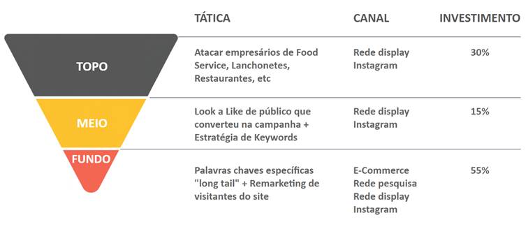 A principal estratégia de marketing pago foi o marketing de performance, complementado por Search Engine Marketing (SEM), mídia programática e Social Media Marketing (SMM). No topo e no meio do funil, o foco esteve em campanhas de awareness via mídia programática — com compra de audiências específicas e uso de audiência própria (“first-party”) — além de SMM com campanhas pagas e públicos “lookalike” de usuários que já haviam se convertido durante a campanha.