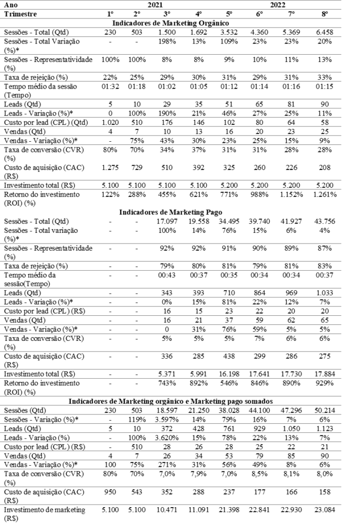 O ROI total cresceu de 603% no 3º trimestre para 1.103% no 8º trimestre. Assim, de todo investimento de marketing realizado, a empresa obteve retorno equivalente a 10 vezes o valor investido, valor considerado ótimo pela alta gestão da Empresa A, pois superou outros canais de vendas da BU. As vendas entre 2020 e 2021 totalizaram 378 unidades — 118 originadas pelo marketing orgânico e 260 pelo marketing pago — com crescimento total de 246%. As vendas pelo e-commerce corresponderam a 32,6% do total de vendas entre os canais. Para fins de comparação, no mesmo período, as vendas via representantes cresceram 40% e representaram 30,5% do total, enquanto o canal de vendedores internos cresceu 325% e respondeu por 37,0% do total. Segundo a alta gestão, esses resultados foram positivos e notáveis, pois, em dois anos, o canal e-commerce superou o canal representante em crescimento percentual.