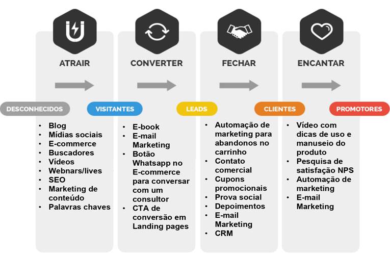 A principal estratégia de marketing orgânico foi o inbound marketing. A Figura 1 representa como a Empresa A aplicou essa metodologia para atrair, converter, fechar e fidelizar clientes ao longo da jornada de compra[12].