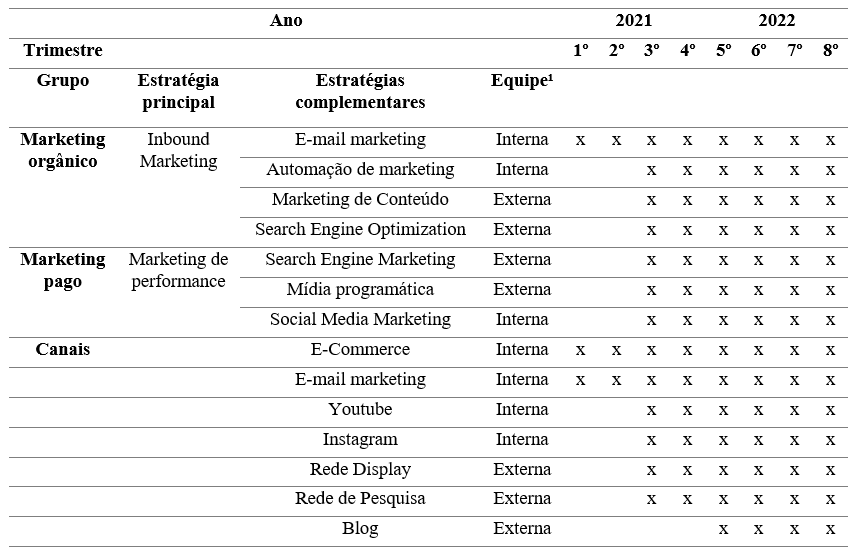 A Tabela 1 apresenta o cronograma trimestral das estratégias de marketing digital e dos canais implementados pela empresa para alavancar os resultados do e-commerce.