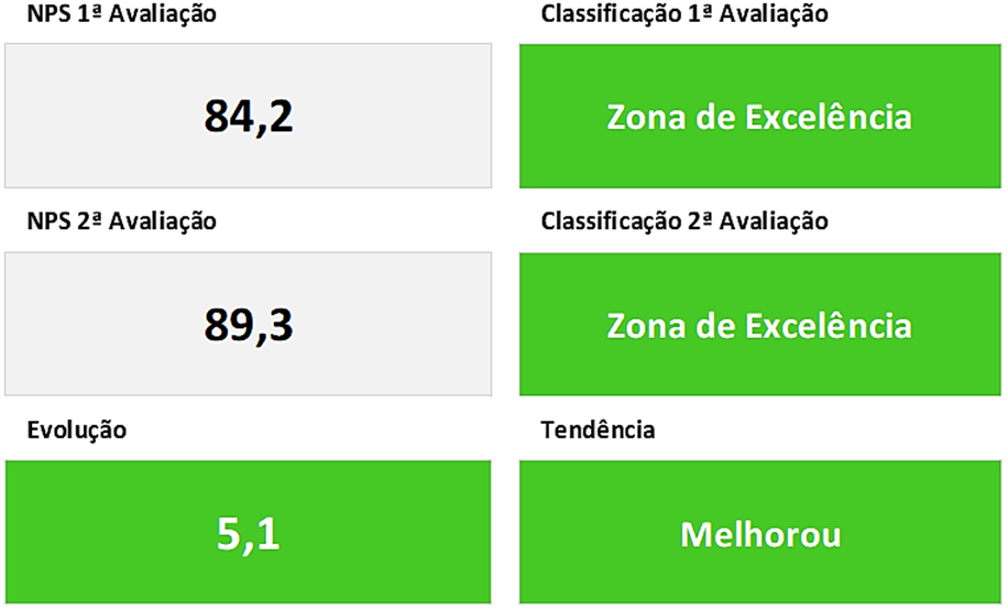 A classificação do NPS ficou dentro da considerada zona de excelência, o que pressupõe grandes possibilidades de a maioria dos clientes ser fiel e realizar a propaganda voluntária (Figuras 4 e 5). Na segunda avaliação houve uma evolução de 5,1 pontos no NPS em relação à primeira, sugerindo que a imagem da empresa diante dos clientes melhorou em doze meses.