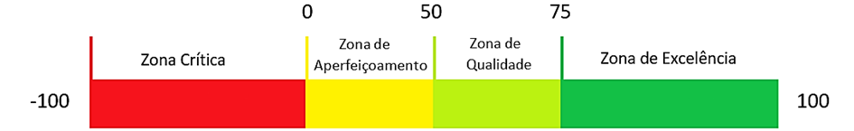 O resultado do NPS é classificado em zonas, conforme Figura 2: Zona Crítica, em que são necessárias melhorias imediatas em conjunto com todo o time e colaboradores; Zona de Aperfeiçoamento, em que o NPS deve continuar buscando atingir as expectativas dos clientes; Zona de Qualidade, em que os clientes estão felizes e a empresa deve permanecer buscando o seu melhor; Zona de Excelência, em que há grandes chances de a maioria dos clientes ser fiel e realizar a propaganda voluntária[12].