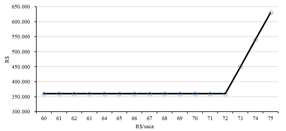 Considerando o pior preço de venda (R$ 60,00/saca), o agricultor teria rentabilidade negativa sobre o capital próprio de 21,9%, o equivalente a um prejuízo de R$ 650.373,30. Se o preço do cereal alcançasse o maior patamar possível (R$ 75,00), a rentabilidade sobre o capital investido chegaria a 23,6%, o equivalente a R$ 699.626,70, o maior lucro dentre os seis cenários considerados neste trabalho.