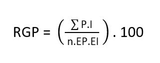 onde, RGP: é o risco geral do projeto; P: são as probabilidades; I: são os impactos; n: é a quantidade de riscos identificados (neste caso, igual a 5); EP: a escala de probabilidades; e EI: a escala de impacto, ambos com valores de 0,9.