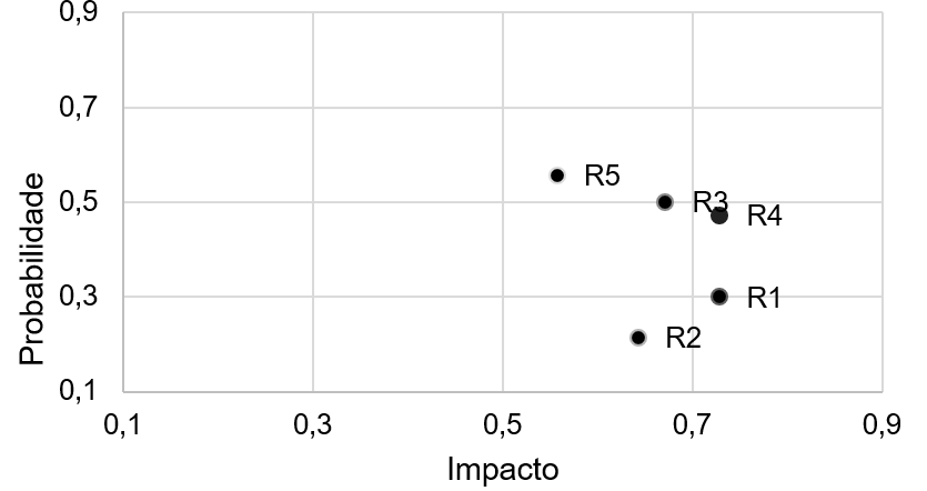 O gráfico abaixo, representado pela Figura 1, apresenta a matriz de risco para cada evento de risco identificado. Ela ajuda a entender o grau de percepção sobre a probabilidade de cada evento ocorrer e sobre seu impacto, caso ocorra. A matriz ajuda também a priorizar os riscos de uma forma mais coerente, evitando o uso de suposições.
