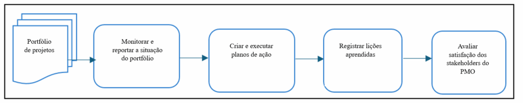 A definição de processos do PMO estabelece o “como fazer” e fornece diretrizes claras para alcançar objetivos organizacionais[15]. O software oferece fluxogramas recomendados, detalhamento das atividades e boas práticas, o que permite adaptar ao cenário de manutenção. Isso garante consistência, qualidade e compreensão, com macrofluxos que orientam todas as funções da estrutura. A primeira função do PMO é monitorar o portfólio (Figura 2), o que permite acompanhar o andamento, riscos, desvios, planos de ação, lições aprendidas e avaliação dos stakeholders, com ênfase em comunicação eficaz entre os envolvidos e apoio à definição do portfólio de projetos.