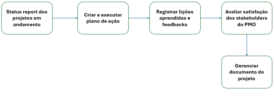 Esta função permite prover situação dos projetos (planejado x realizado), analisar desempenho, implementar planos de ação, registrar lições aprendidas e feedback, avaliar stakeholders, gerenciar projetos e documentação, além de fornecer relatórios de desempenho à alta administração para garantir prazos e custos estabelecidos (Figura 3).