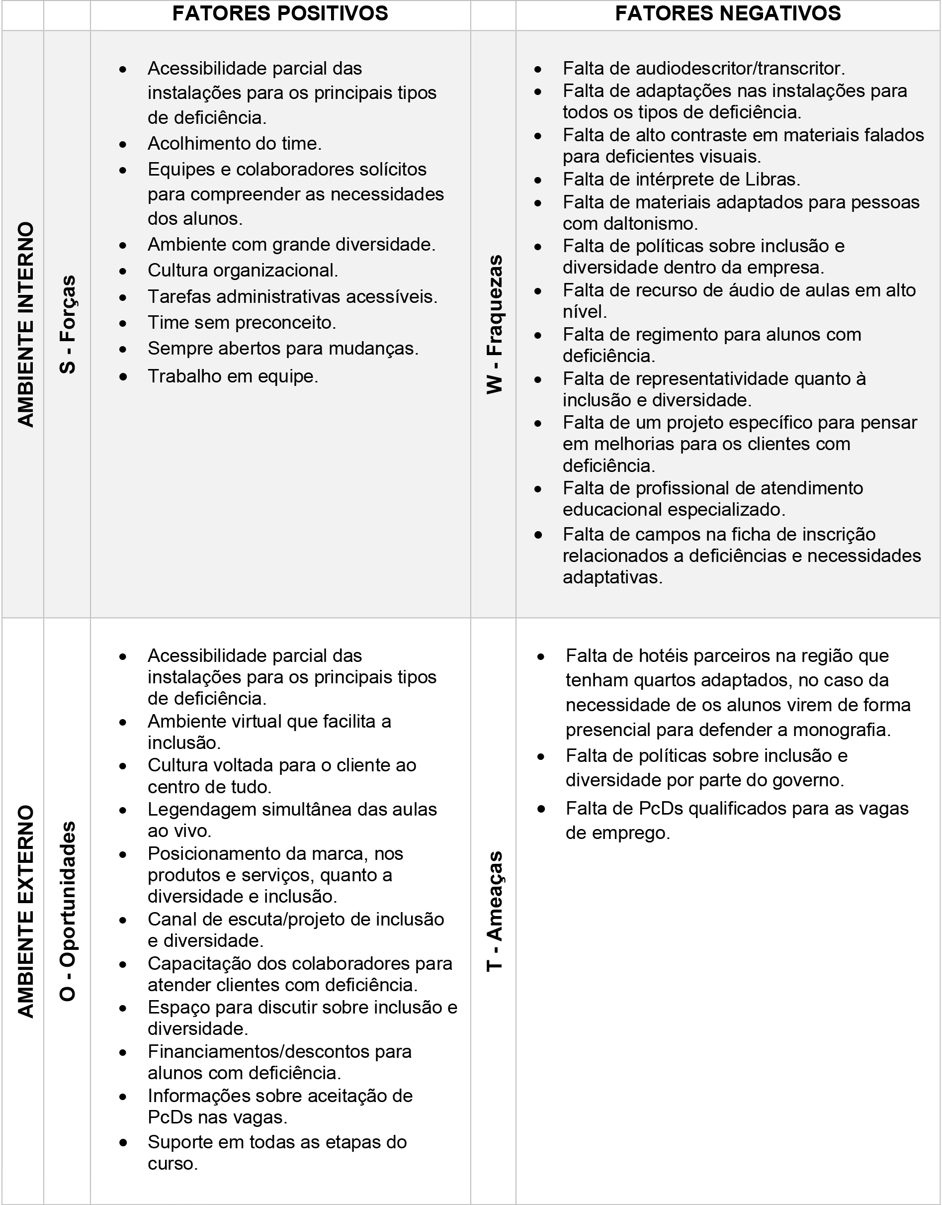 A partir dos dados coletados, foi realizada uma análise strengths, weaknesses, opportunities e threats (SWOT) quanto ao processo de diversidade e inclusão, tanto na visão dos alunos como na dos colaboradores[14].